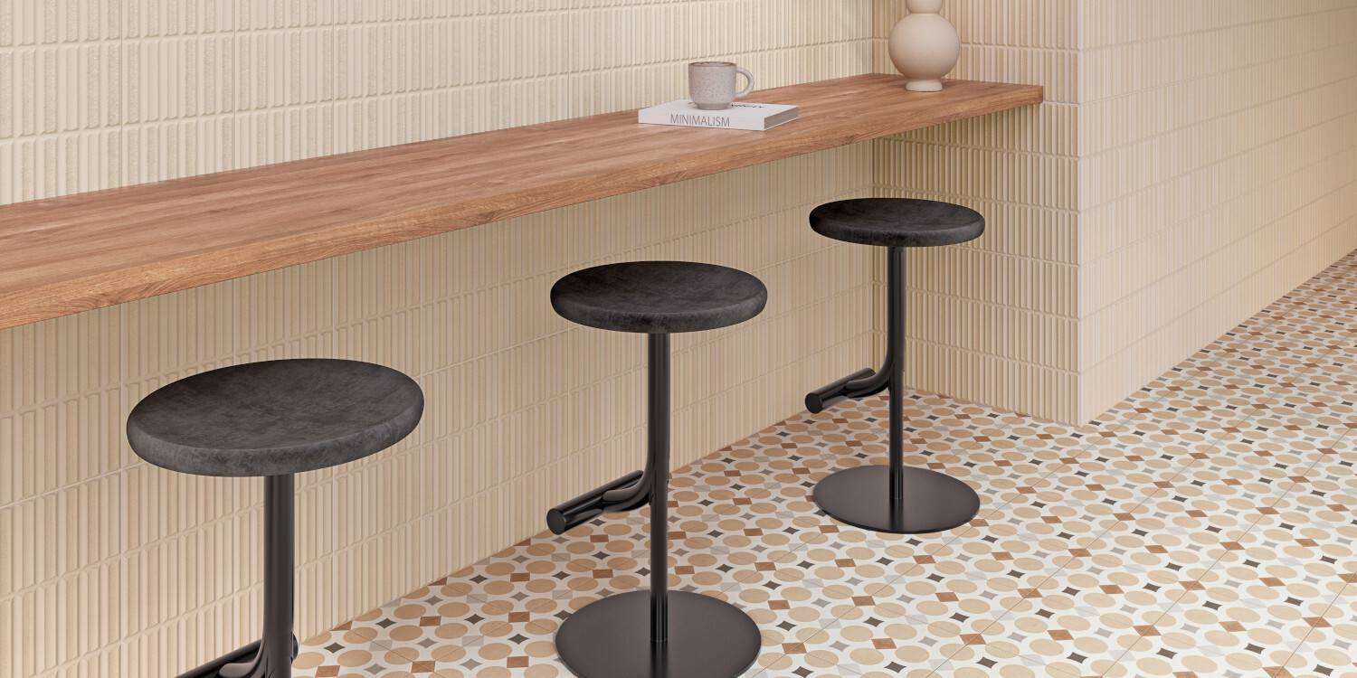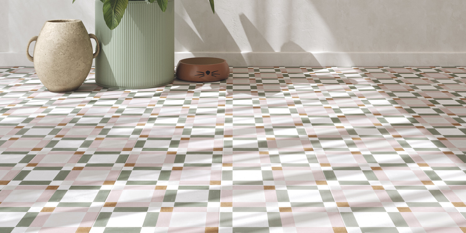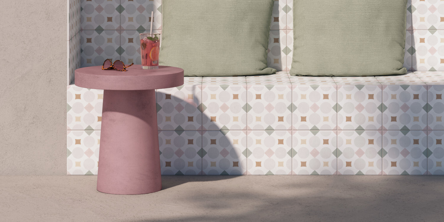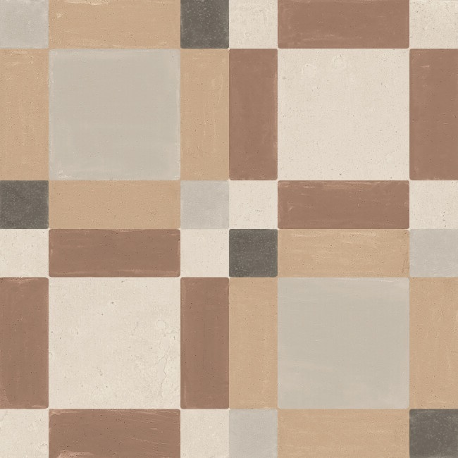 La geometría, el color y la artesanía, se dan cita en la colección PATTERNS. Una mezcla armónica de colores, así como el recurso de las geometrías, otorgan a la colección una apariencia decorativa y personal. Sobre un fondo de apariencia cementosa, apreciamos los trazos pincelados de las líneas que aportan color y un toque artesanal y diferenciador dentro de un conjunto regular y ordenado. Destacan dos gamas cromáticas de fácil combinabilidad presentadas en formato 22,3x22,3 cm.