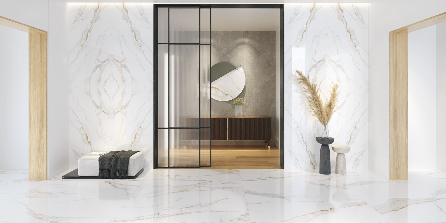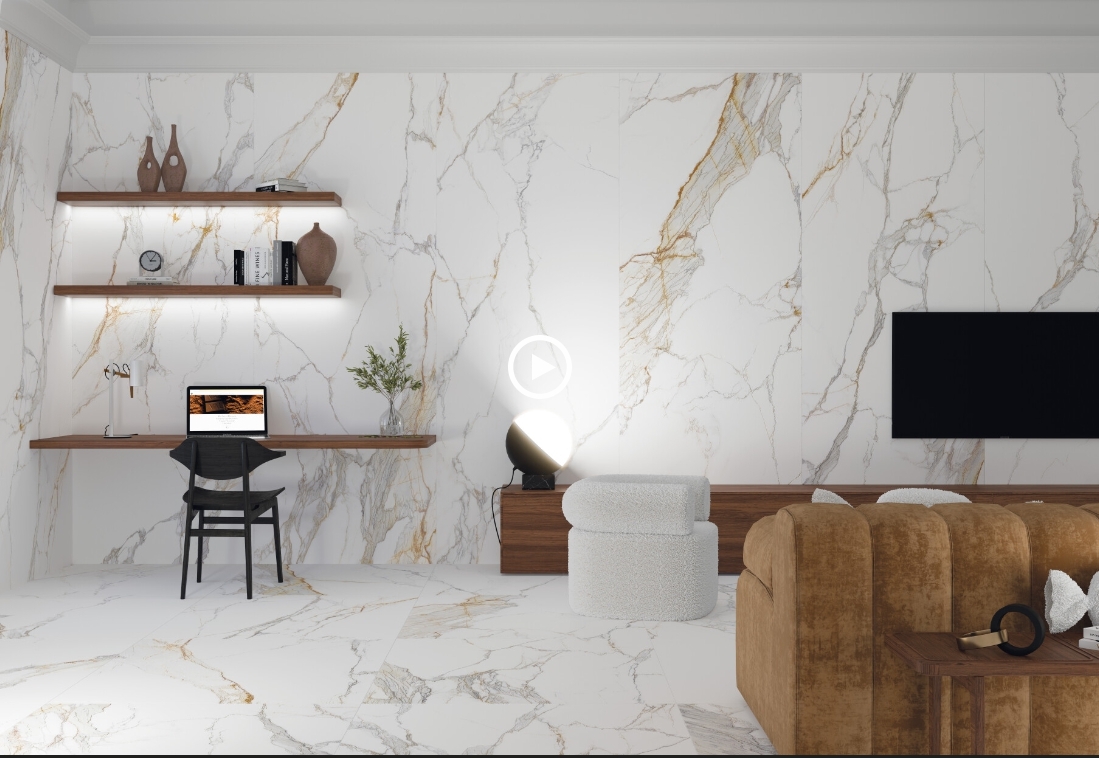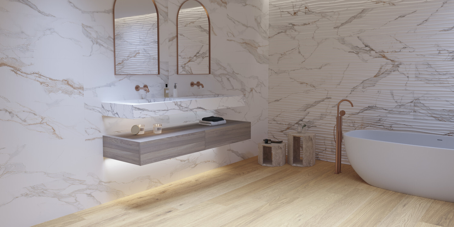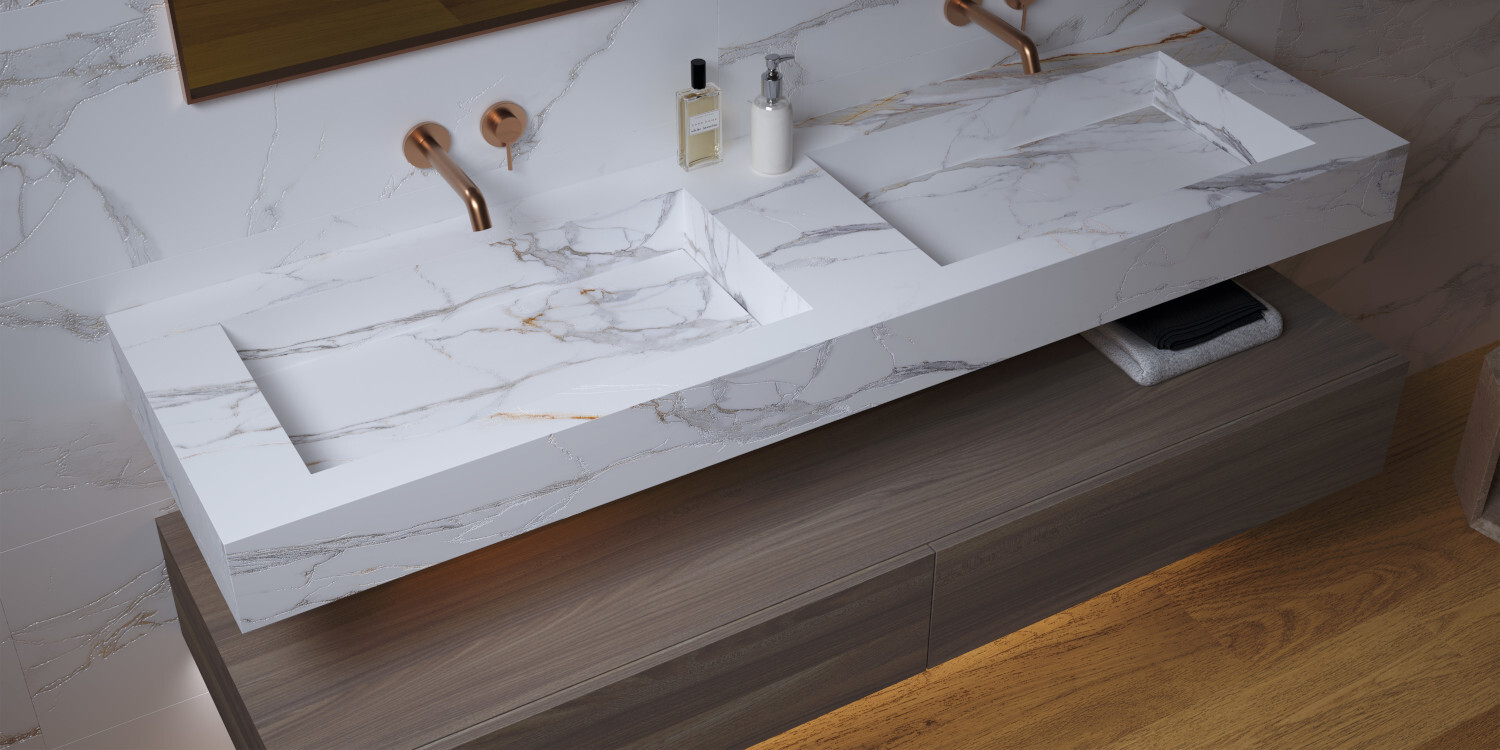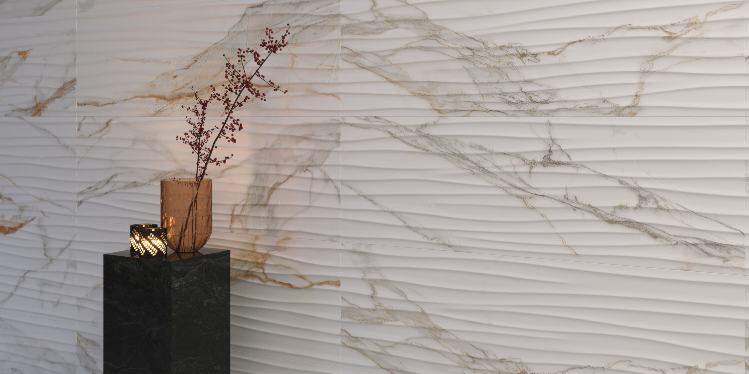 PRALINE se inspira en el exclusivo mármol Calacatta Macchia Vecchia de origen italiano. Su diseño de mármol blanco con vetas grises destaca por un veteado en tonalidad caramelo, el cual le confiere identidad y distinción. En proyectos de interiorismo y arquitectura se convierte en la alternativa perfecta gracias a su calidez y luminosidad. Se presenta en los formatos 100x275 cm, 100x180 cm, 100x100 cm, 75,5x150 cm y 60x120 cm, y en los acabados Premium Polished, Polished, Shaped y Natural. Incorpora un revestimiento de pasta blanca en 33.3x100 cm con su correspondiente decorado en DEEP TECH. Y además, incluye la opción decorativa en book match en formato 75.5x151 cm y acabado Polished. Dado que es un diseño versátil, fácilmente combinable con otras texturas como pueden ser maderas o piedras, se ha incorporado la solución de encimera de 12 mm, en formato 150x320 cm. En dos acabados innovadores Shaped y Premium Polished, con su respectivo book match