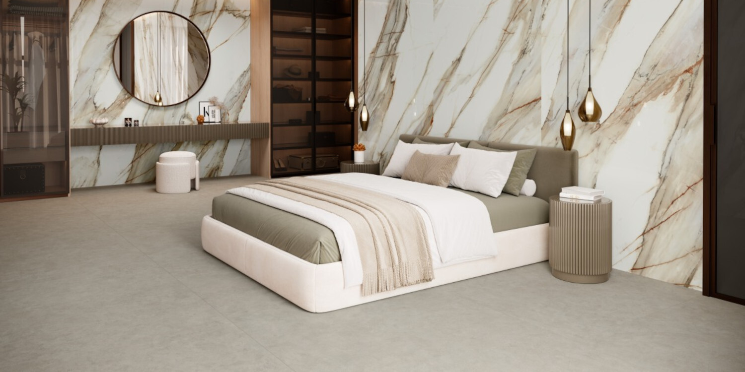 Las maxis vetas son las auténticas protagonistas de la serie Macchia Vecchia. Elegantes vetas transversales en tonalidades grises y doradas que fluyen de forma elegante.